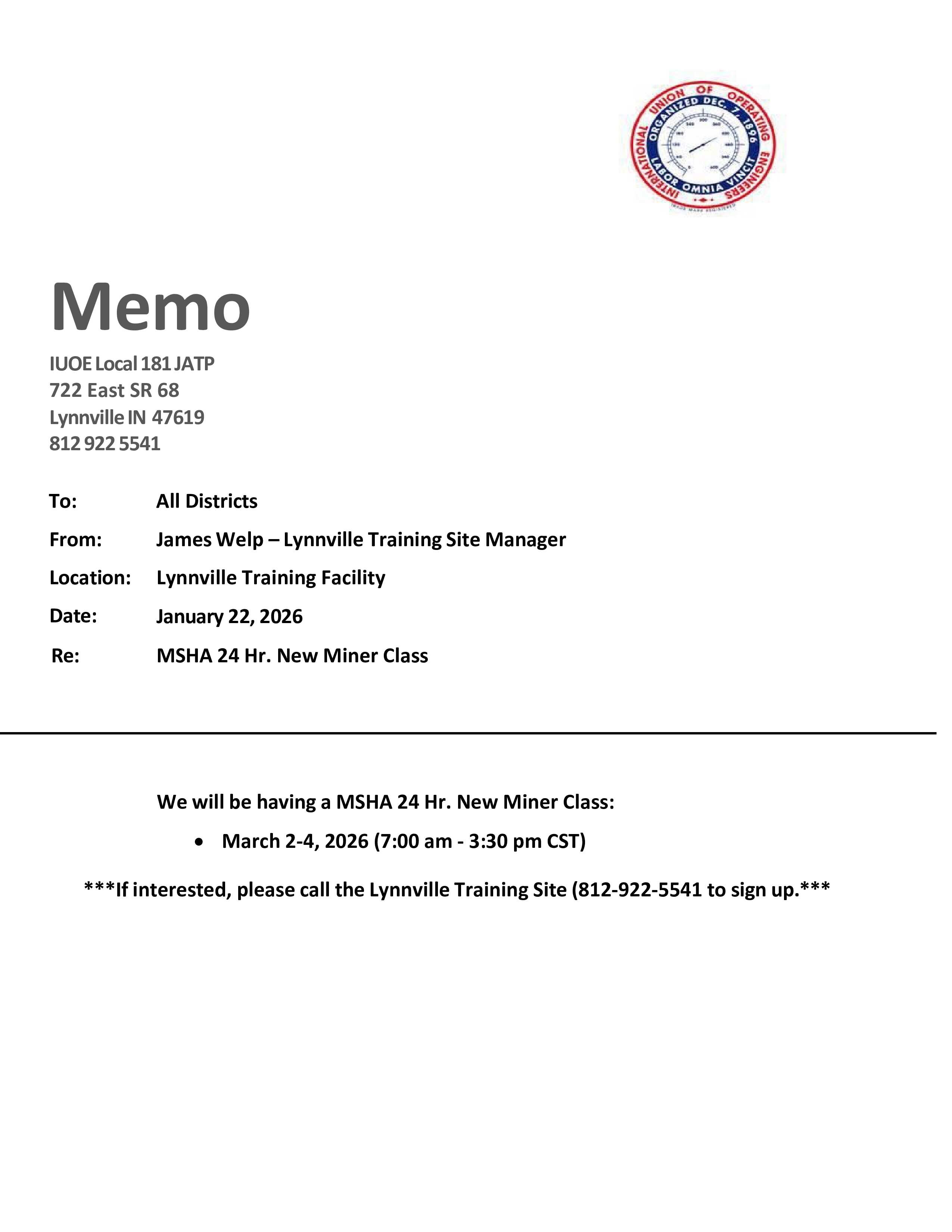 We will be having a MSHA 24 Hr. New Miner Class -- March 2 - 4, 2026 (7:00 am - 3:30 pm CST).